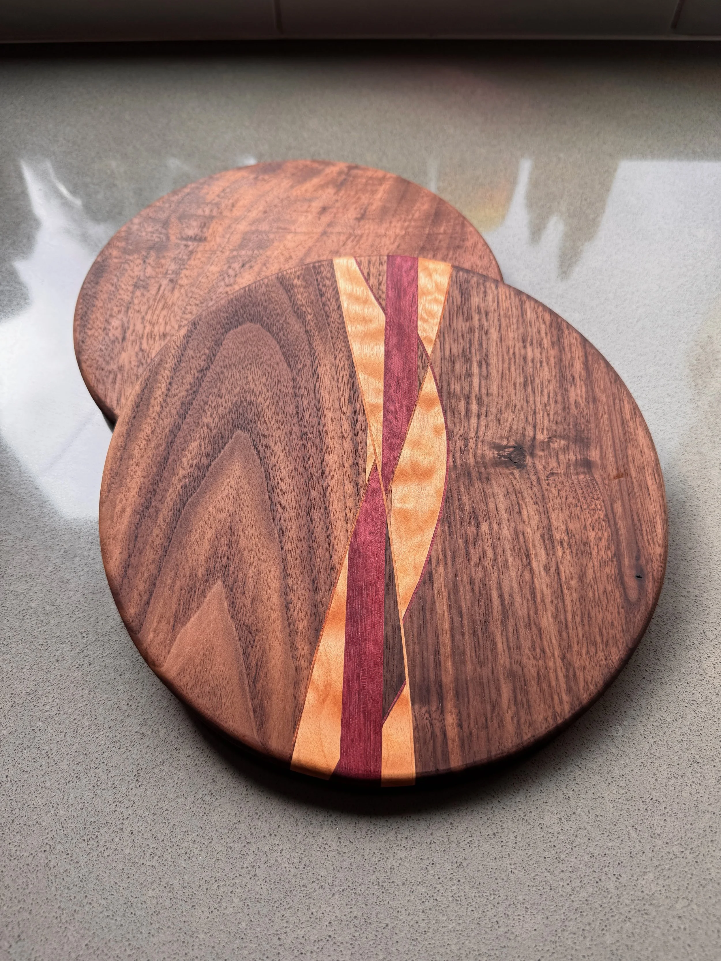 Handmade 10” wooden cake round, made from walnut with maple and purpleheart accents and finished with a food-safe tung oil blend.